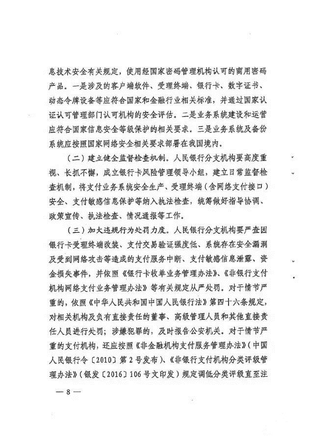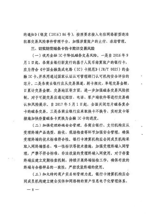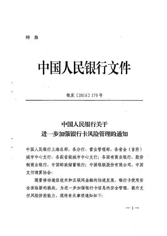 央行下发特急通知央行《中国人民银行关于进一步加强银行卡风险管理的通知》 ,,,给各机构 ,,,此次通知主要在面对移动通信技术和移动金融迅速发展的情况下 ,,,银行卡支付安全方面面临着新的挑战 ,,,央行此次文件覆盖的内容较全面的对参与银行卡支付产业各机构给出比较明确的管控指导方向!