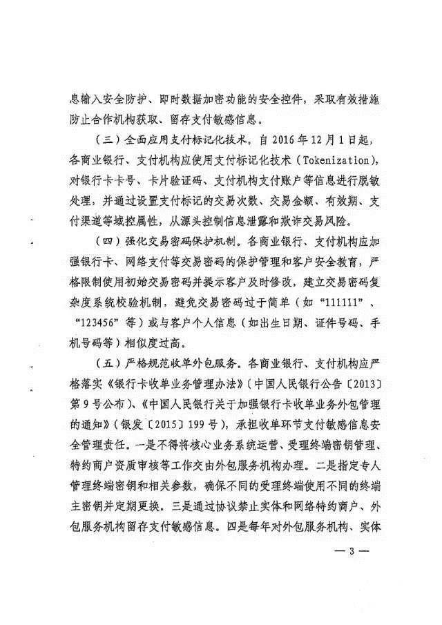 2016年12月1日起全面实行支付技术标记化处理支付机构应使用支付标记化技术 ,,,对银行卡卡号、、、卡片验证码、、、支付机构支付账户等信息进行脱敏处理 ,,,并通过设置支付标记的交易次数、、、交易金额、、、有效期、、、支付渠道等域控属性 ,,,防范交易风险!