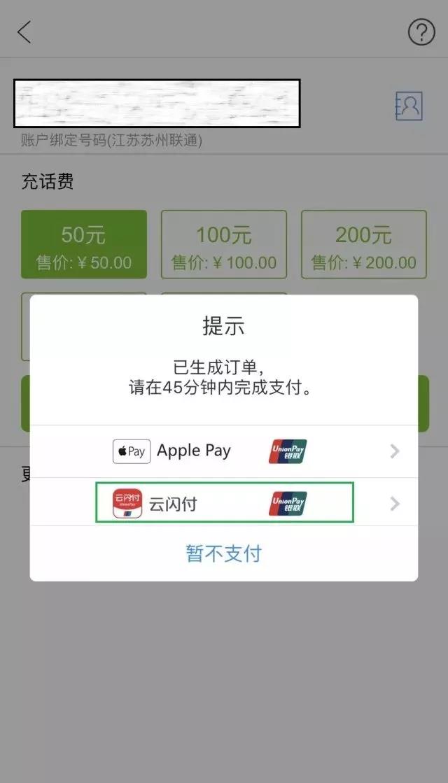 在云闪付APP内进行手机充值时选择【云闪付】付款 ,,,充值金额(非实付金额)满50元 ,,,即可享受随机立减1-10元优惠。。。活动期间每日限量5万笔 ,,,单用户每自然月限享受1笔优惠 ,,,数量有限 ,,,先到先得。。。