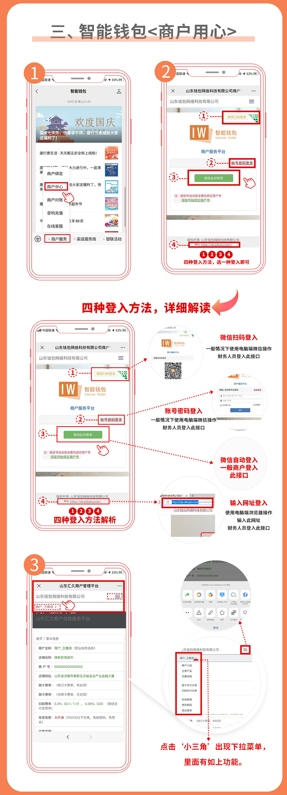 智能钱包对账平台分为电脑端和公众平台两种登录方式 ,,,使用条码付直联商户号登录。。。